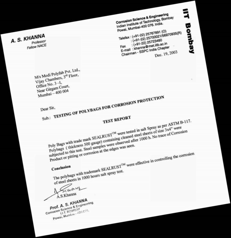 Sealrust VCI® Anti-Corrosion Poly Product was tested in “Salt Spray Chamber” as per ASTM B-117. The tests were carried out at Department of Corrosion Science & Engineering, Indian Institute of Technology (IIT), Mumbai, India in year 2003, and ELCA Quality Systems & Calibrations Pvt Ltd (NABL Certified Lab) in year 2025
